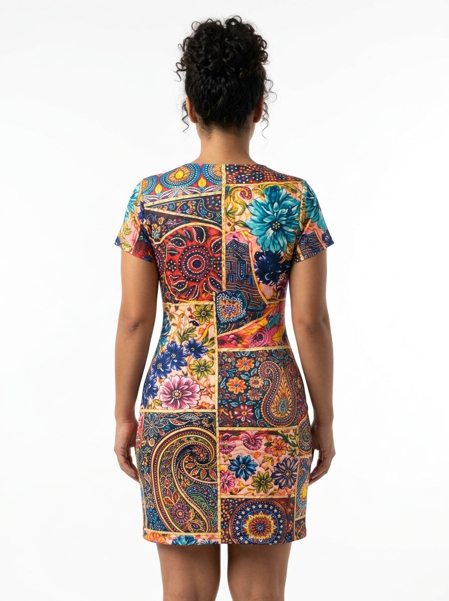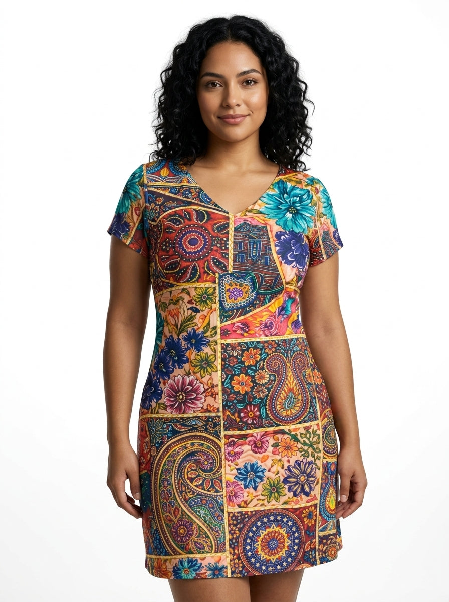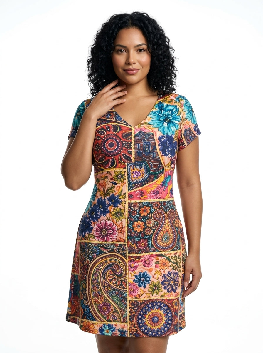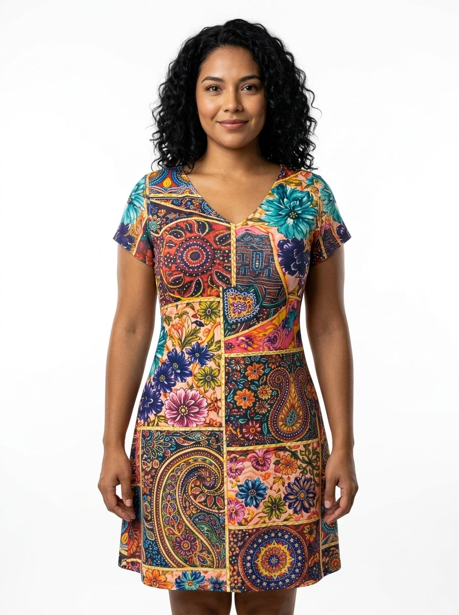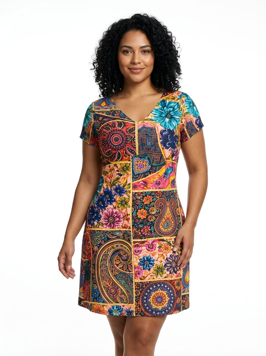 Robe Cléa. On craque pour le mélange de couleurs vibrantes de cette robe, qui mettra assurément un peu de soleil dans votre quotidien. Avec son imprimé patchwork dynamique, c'est la tenue toute désignée quand vous avez envie de vous sentir jolie sans trop d'efforts.