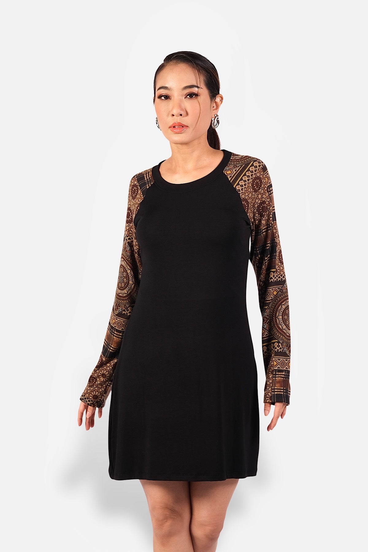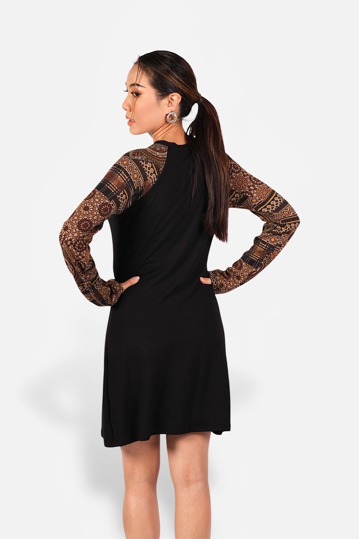 La Robe Elenia combine sobriété et originalité grâce à son panneau central noir contrasté par des manches imprimées médail­lon ocre. Une pièce chic et confortable à porter au quotidien.