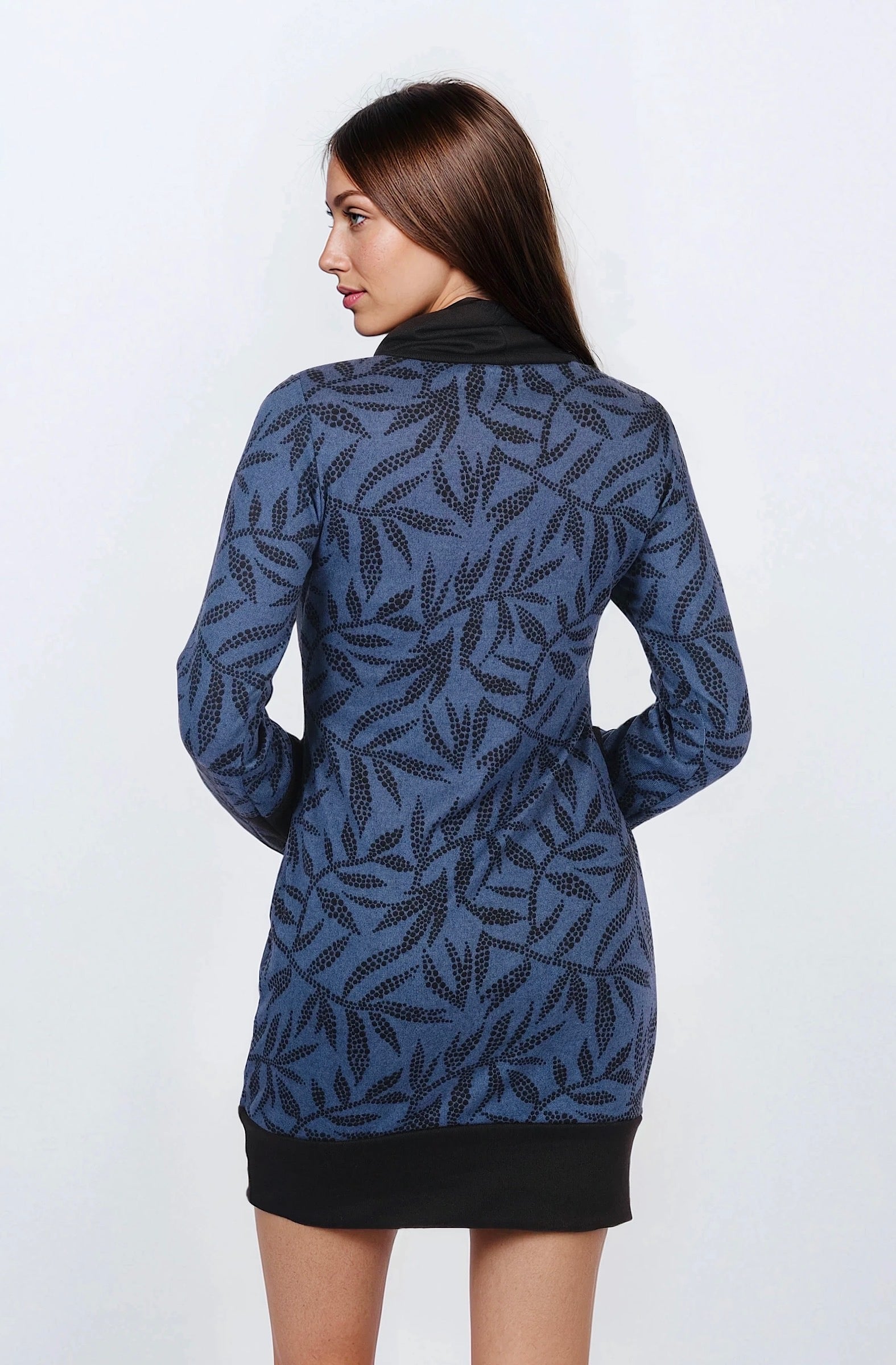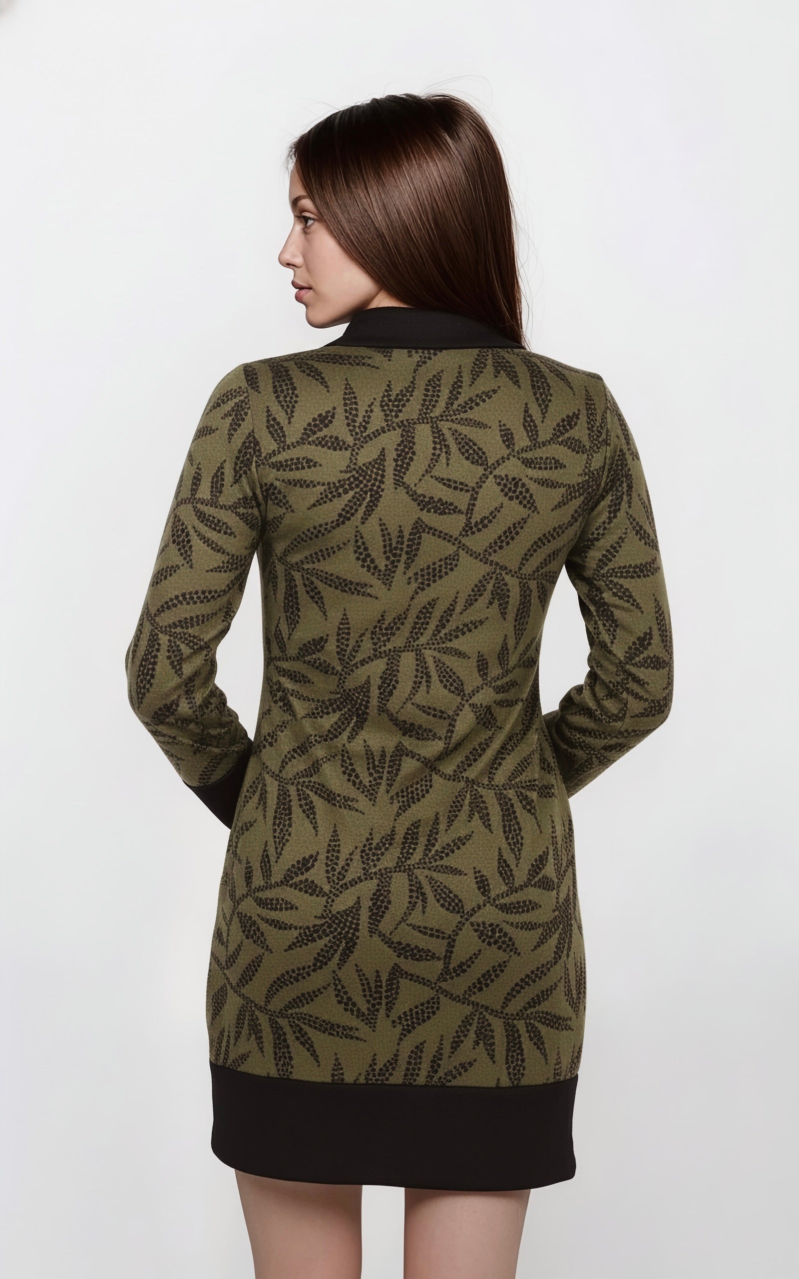 La Robe Maëlle se distingue par ses détails à boutons et son imprimé feuillage bordeaux et noir. Une robe à col roulé souple qui allie confort et élégance.