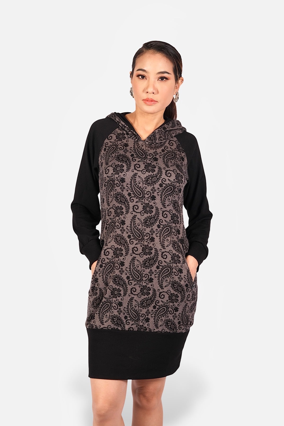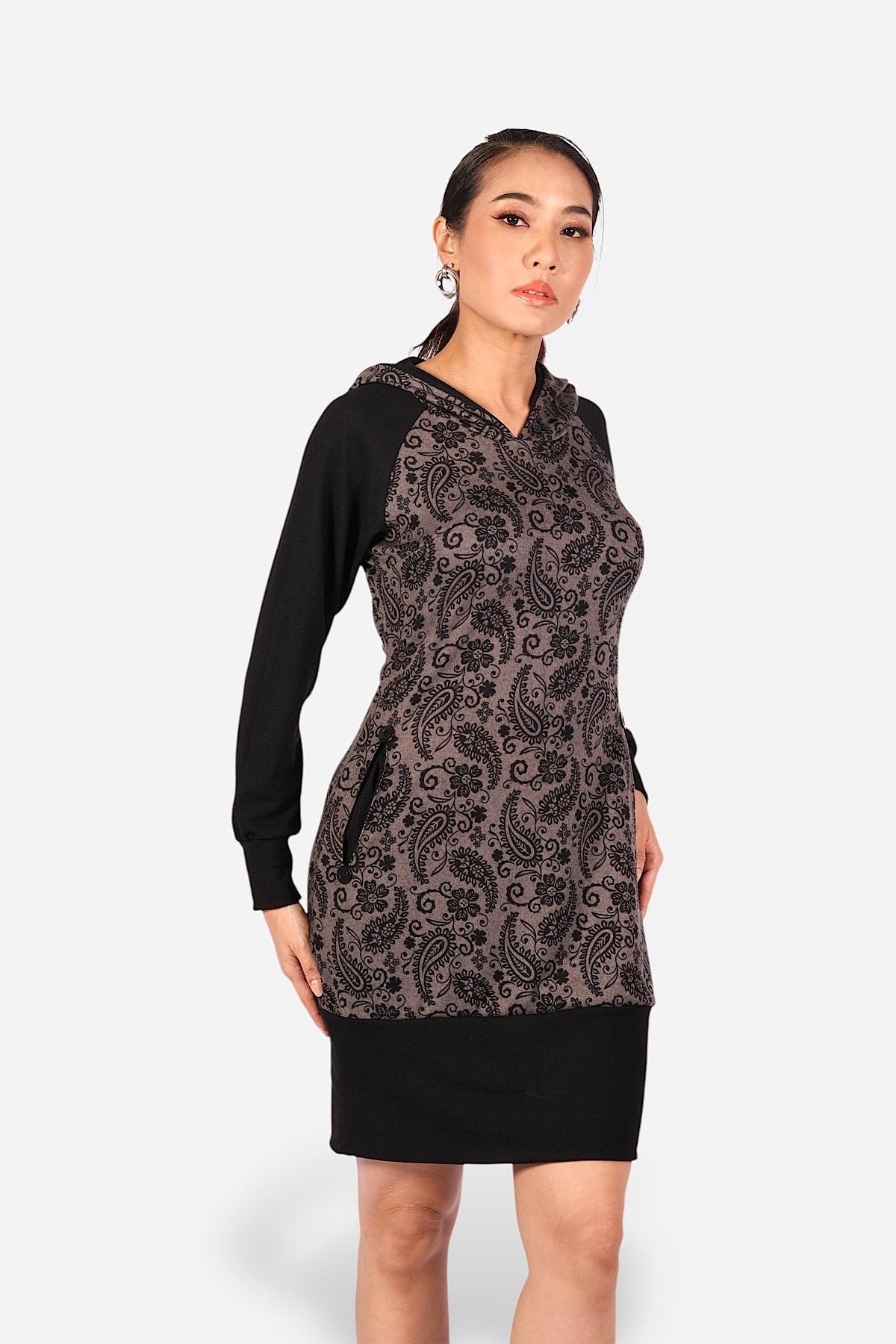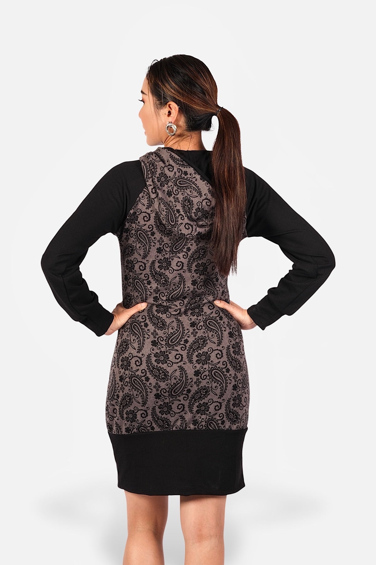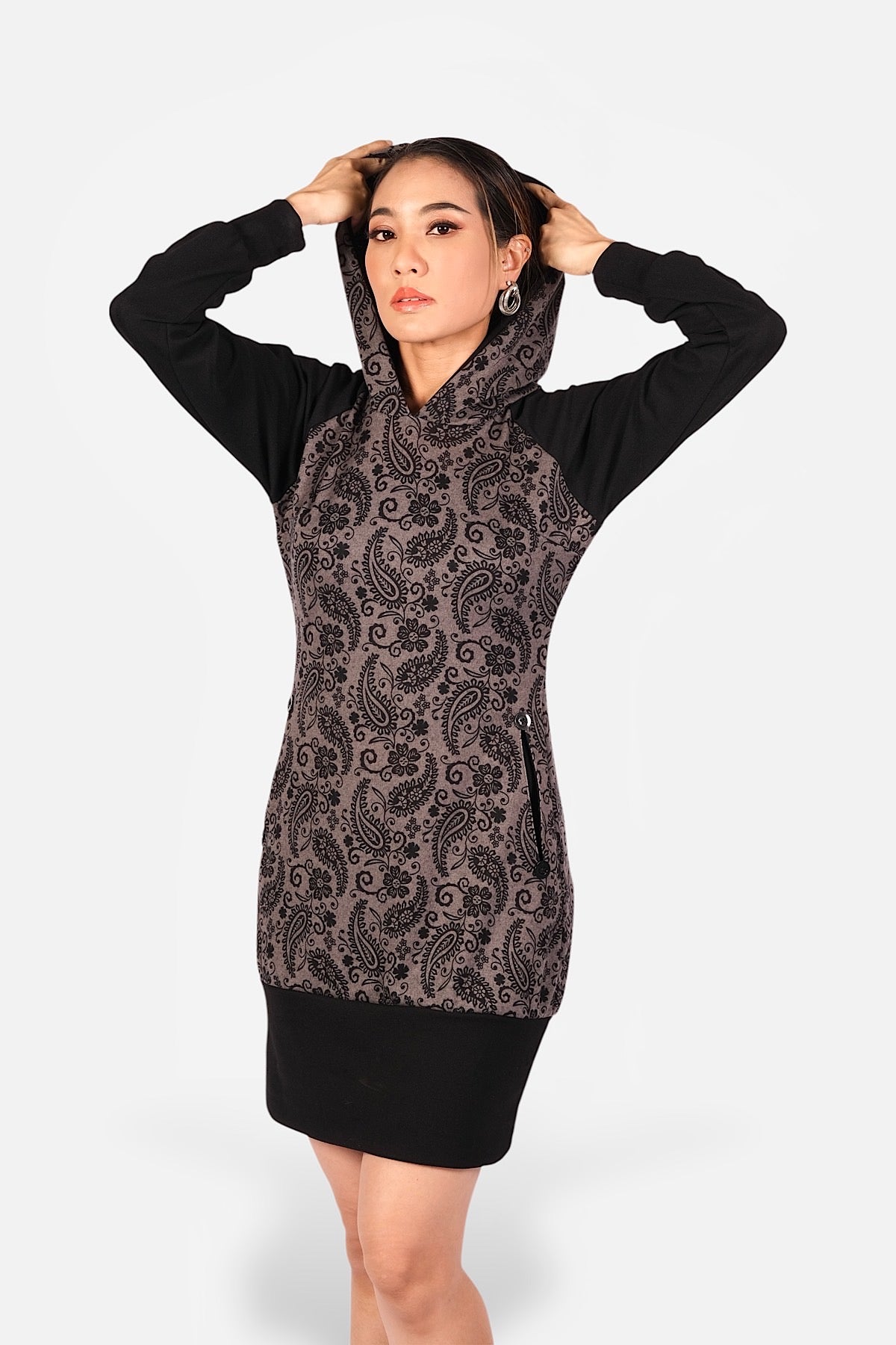 La Robe Naïa revisite le style décontracté avec son imprimé cachemire gris/noir, sa capuche pratique et ses poches kangourou. Confort et style réunis pour vos looks du quotidien.